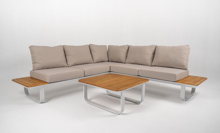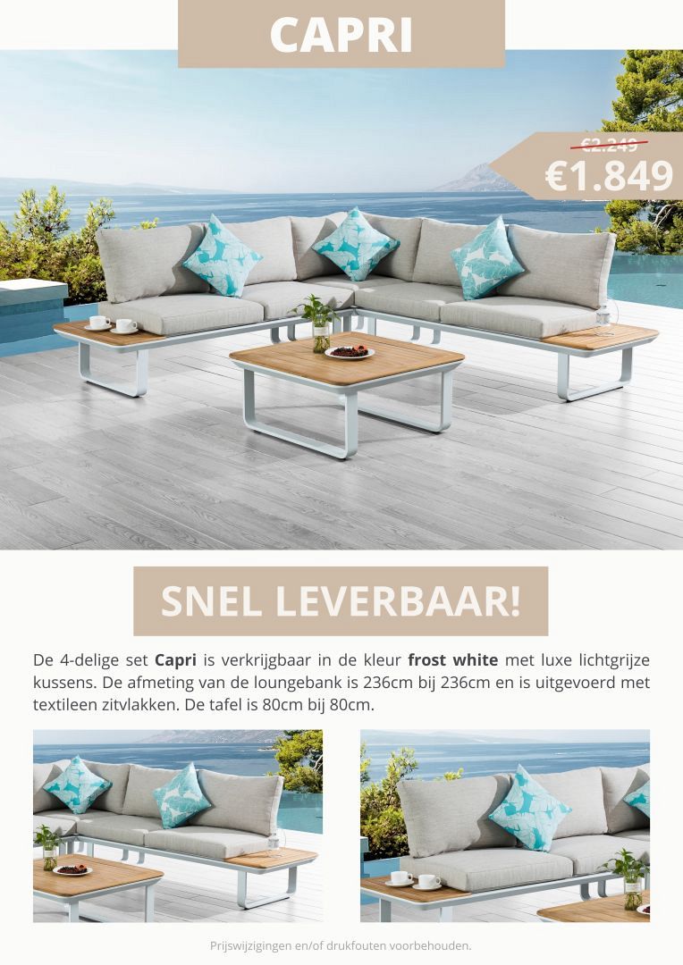 De geronde kanten van de Capri te samen met de teakhouten delen zorgen voor een tijdloze en luxe uitstraling. Waar de textileen zittingen en de 12cm kussens zorgen voor een prettig zitcomfort.Specificaties